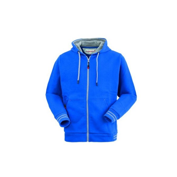 Felpa con chiusura centrale con cerniera in plastica, cappuccio chiuso con cordino, interno del cappuccio di colore a contrasto, parasudore interno al collo.