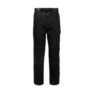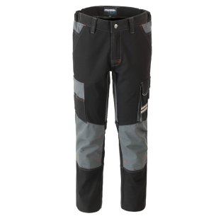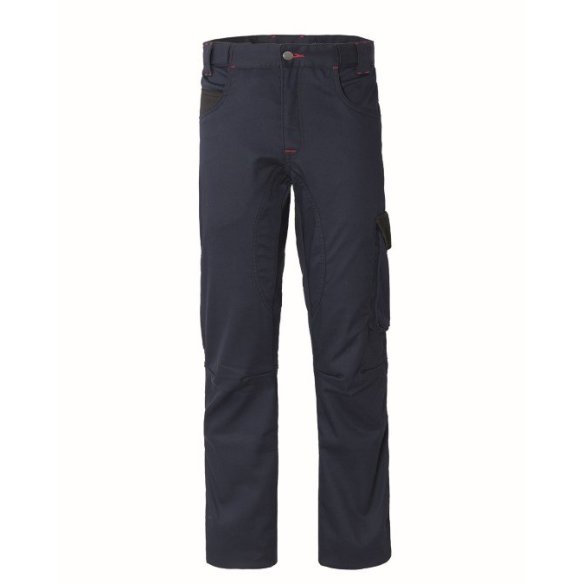 Pantalone da lavoro multistagione con chiusura alla patta con cerniera e bottone in cintura, 2 tasche anteriori interne e 1 piccolo taschino di colore a contrasto a destra, 2 tasche posteriori applicate chiuse con aletta e velcro, 1 tasca laterale con soffietto chiusa con aletta e velcro a destra, 1 tasca laterale multifunzione applicata su gamba sinistra, inserto laterale porta utensili, tessuto di rinforzo al cavallo con tripla cucitura, pences alle ginocchia per il massimo confort, esclusivo elastico in vita, passanti rinforzati, travette varie di colore rosso.