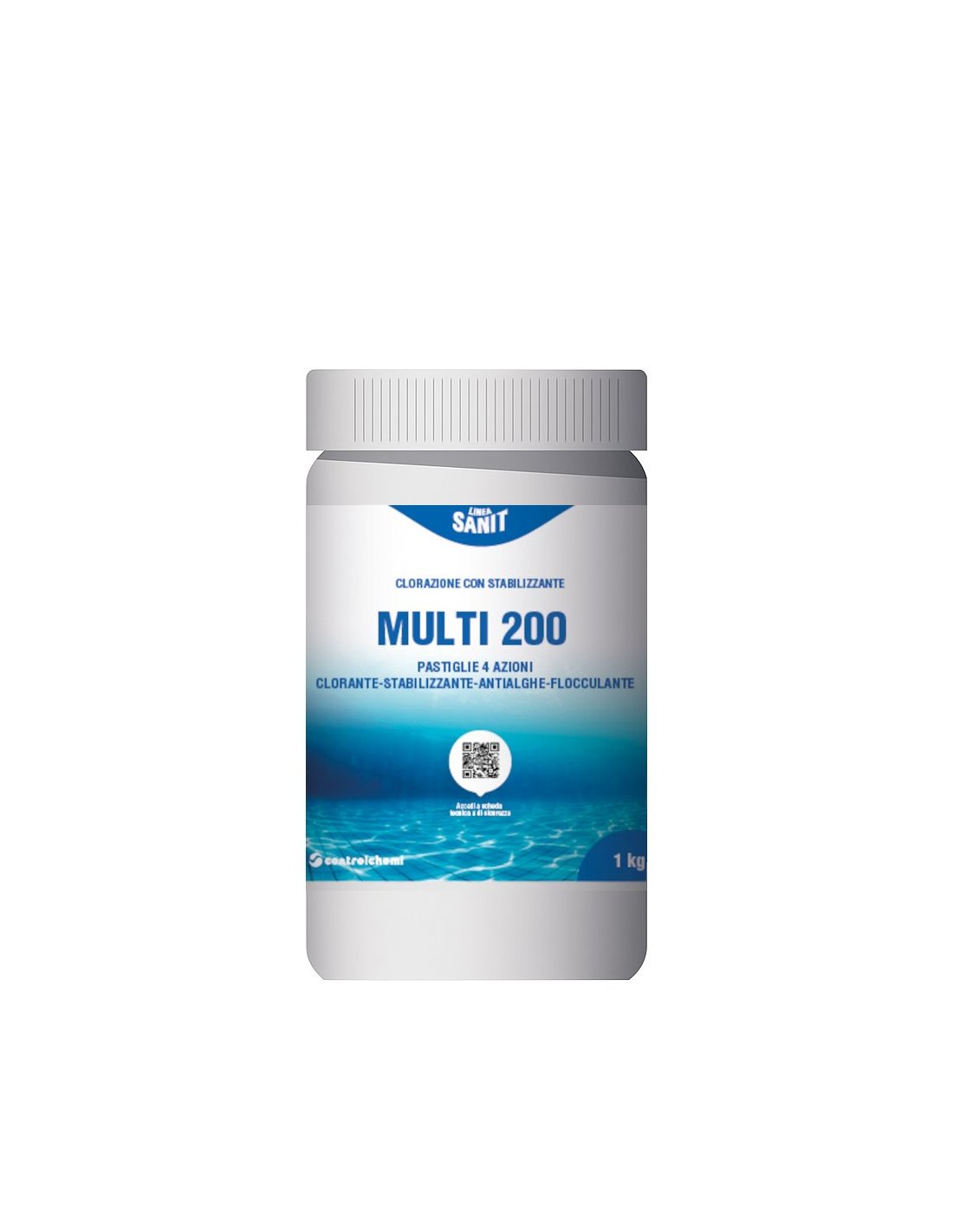 MULTI 200 contiene un composto clorante a base di acido Tricloroisocianurico (Simclosene) all’80% di Cloro attivo disponibile, un flocculante ed un antialghe per il trattamento dell’acqua delle piscine scoperte.