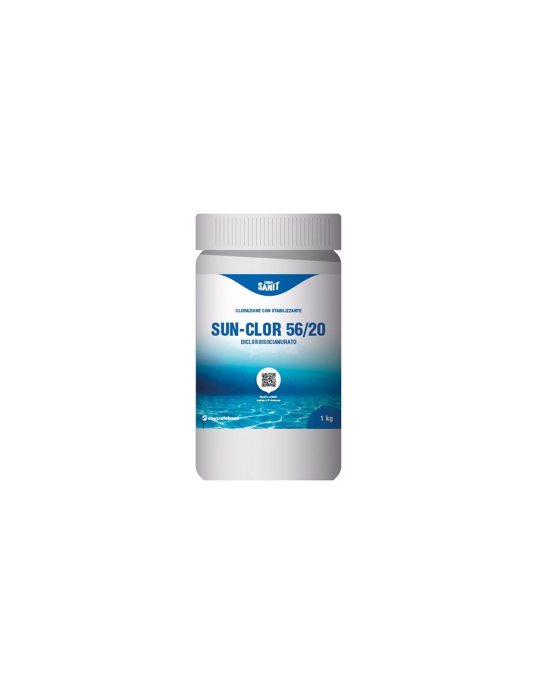 SUN-CLOR 56/20 è un prodotto clorante in pastiglie da 20 g a rapida solubilità a base di Dicloroisocianurato sodico (Troclosene Sodico Biidrato).