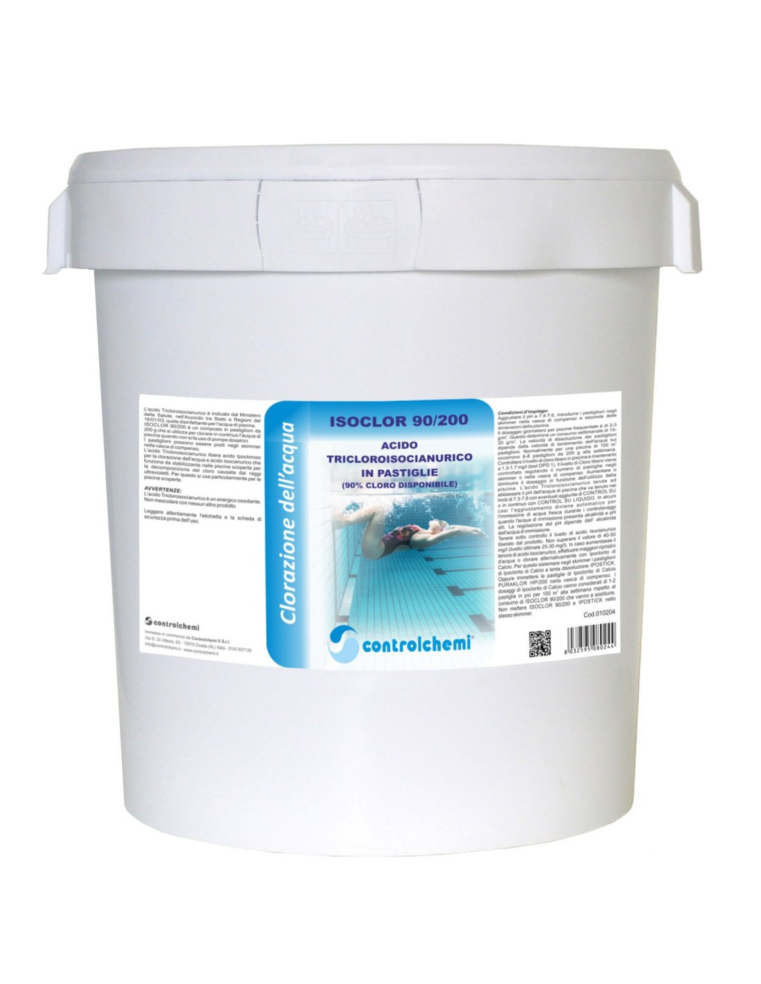 ISOCLOR 90/200 è un composto in pastiglioni da 200 g che si utilizza per clorare in continuo l'acqua di piscina quando non si fa uso di pompe dosatrici.