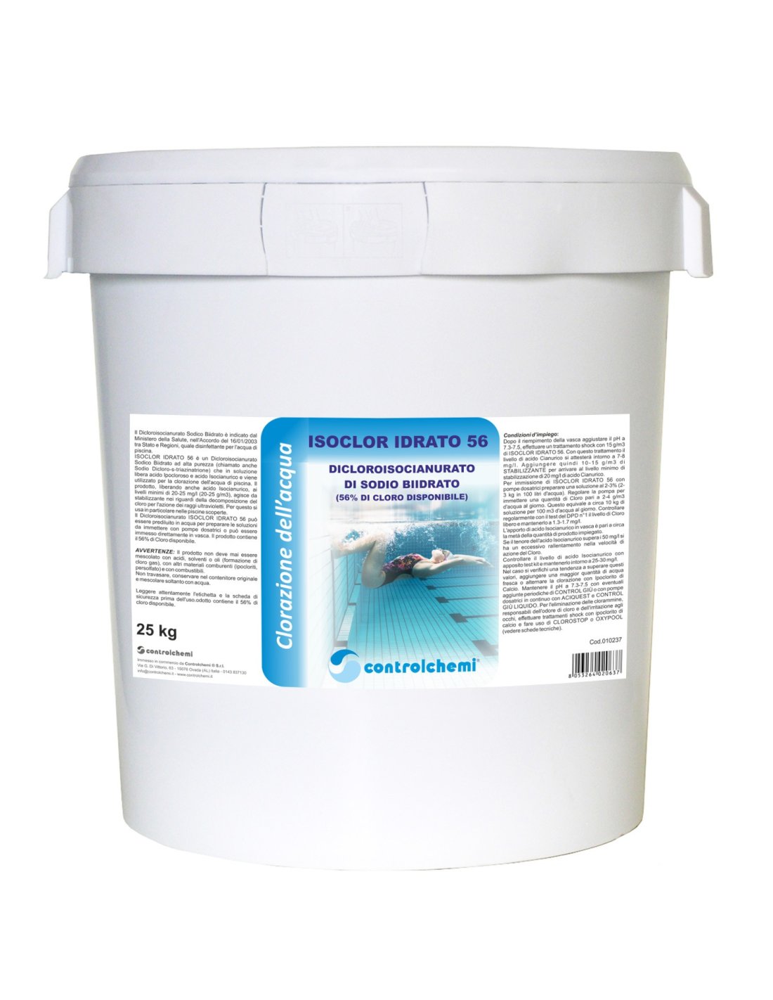 ISOCLOR IDRATO 56 è un Dicloroisocianurato Sodico Biidrato (Troclosene Sodico Biidrato) ad alta purezza che in soluzione libera acido Ipocloroso e acido Isocianurico e viene utilizzato per la clorazione dell'acqua di piscina.