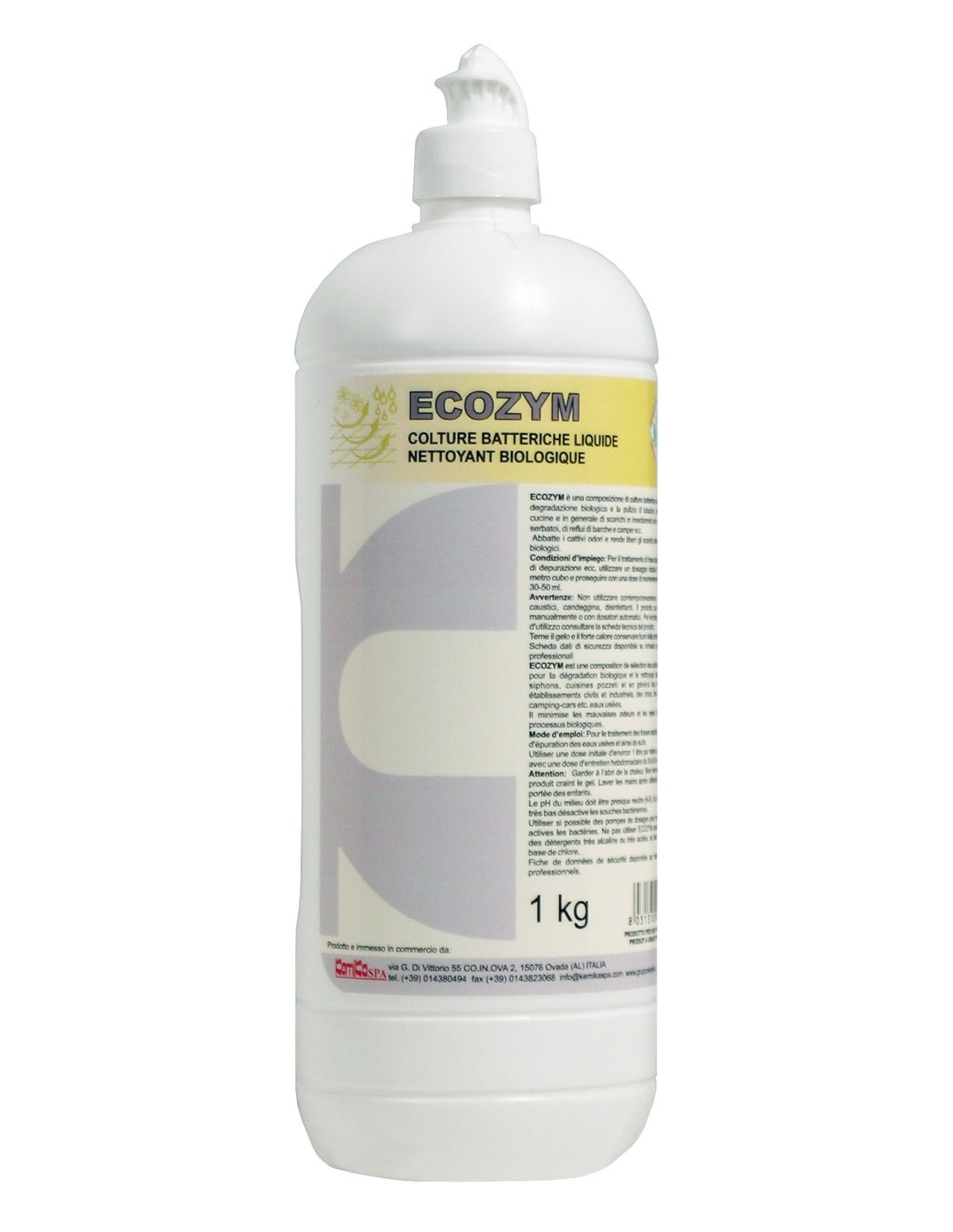 ECOZYM è una miscela di ceppi batterici viventi selezionati per la degradazione biologica e l’eliminazione di residui di grassi, proteine, amido, cellulosa, tensioattivi, residui alimentari, rifiuti umani, da sifoni, tubazioni, condotte, scarichi, pozzetti d’intercettazione grassi, fosse settiche, fosse biologiche, ecc.