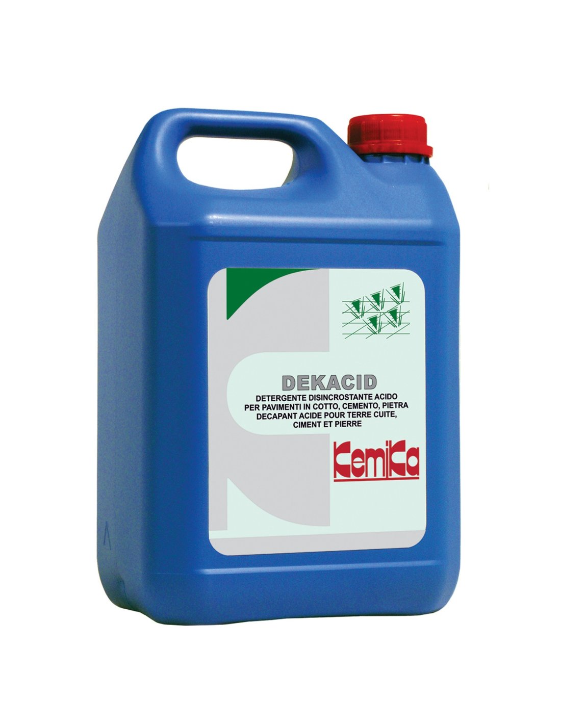 DEKACID è un detergente a bassa schiuma, a base di acido fosforico e altri acidi ad azione sinergica, formulato per il lavaggio di fondo dei pavimenti in cotto, cemento e pietre resistenti agli acidi.