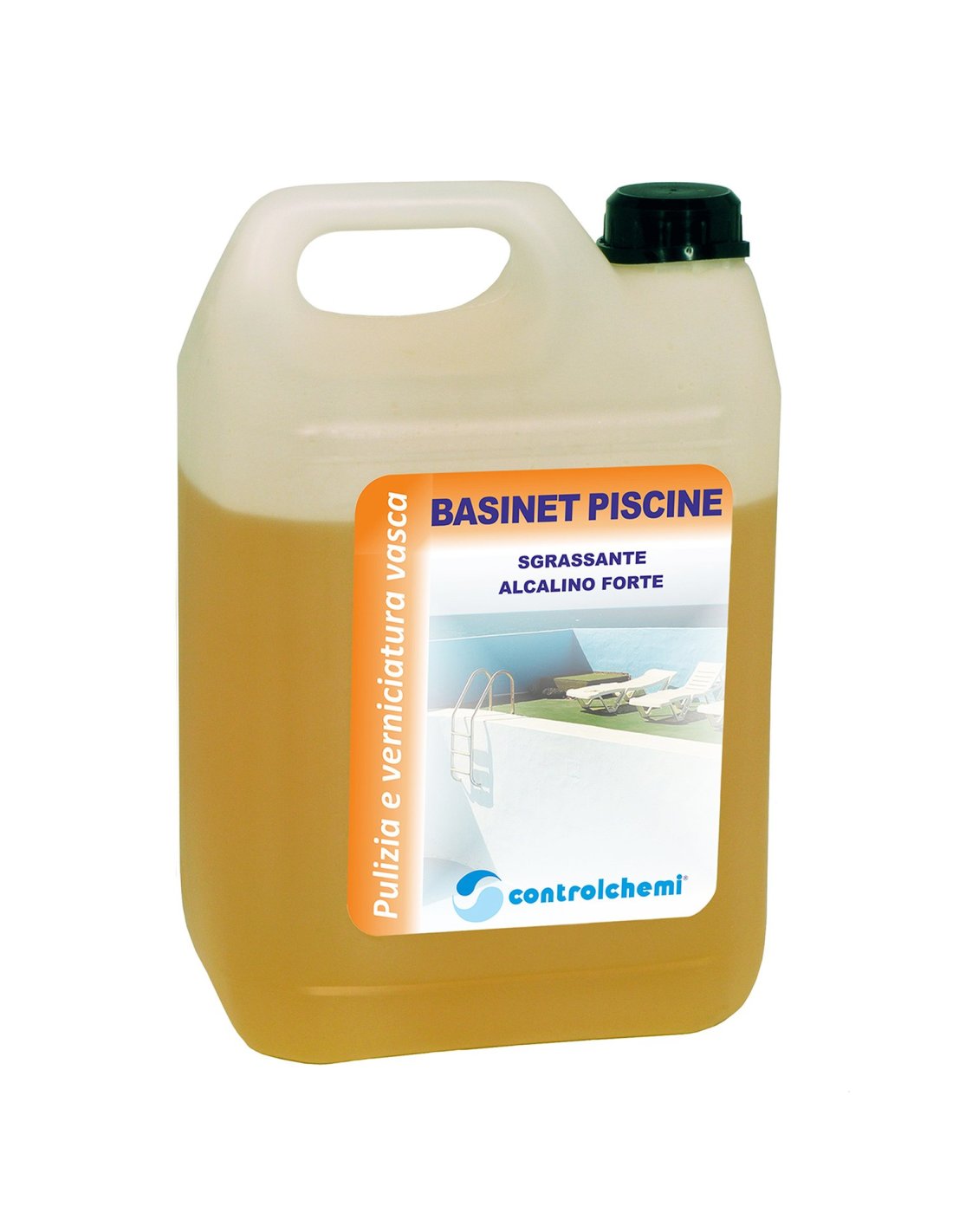 BASINET PISCINE è un detergente sgrassante liquido fortemente alcalino formulato per il lavaggio delle vasche molto sporche prima del riempimento.