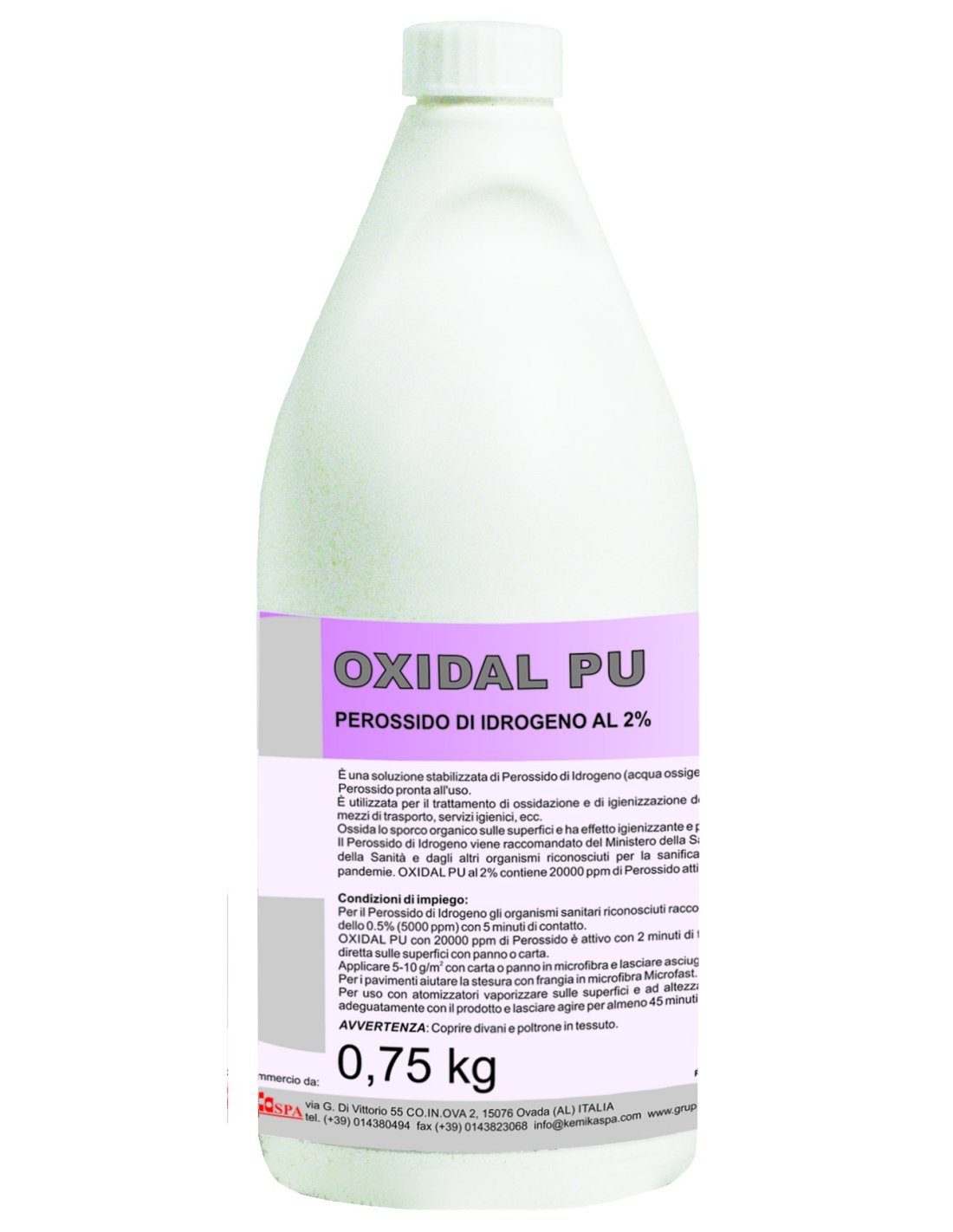 OXIDAL PU è una soluzione stabilizzata di Perossido di Idrogeno (acqua ossigenata) al 2% (20000 ppm) di Perossido pronta all’uso.
