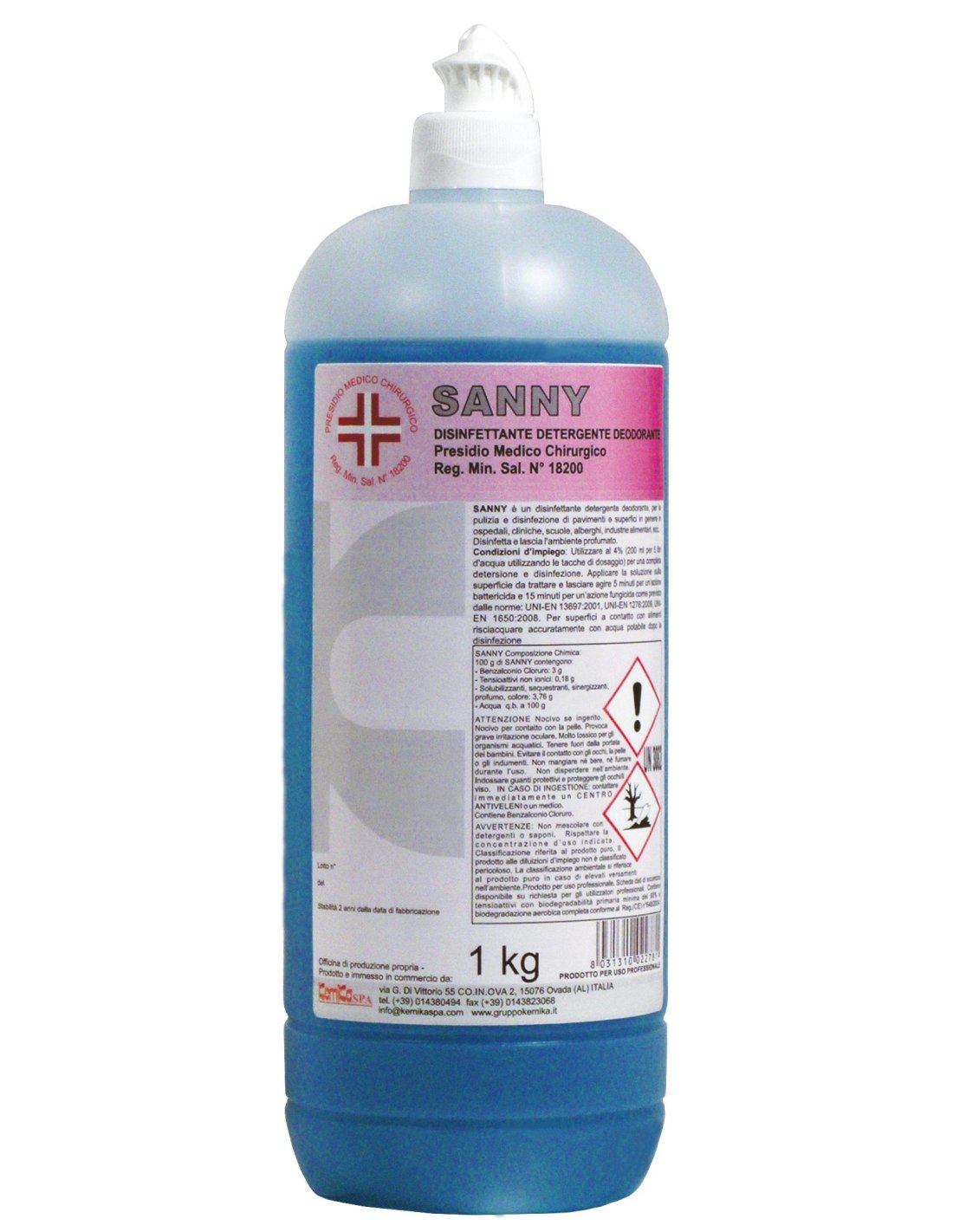 SANNY è un disinfettante detergente deodorante al 3% di quaternario attivo, per la pulizia e disinfezione di tutti i tipi di pavimenti, anche protetti con cere metallizzate, attrezzature (telefoni, tastiere computer, tavoli, spalliere del letto, ecc) e servizi igienici in ospedali, cliniche, convivenze, scuole, alberghi, industrie alimentari, ecc.
