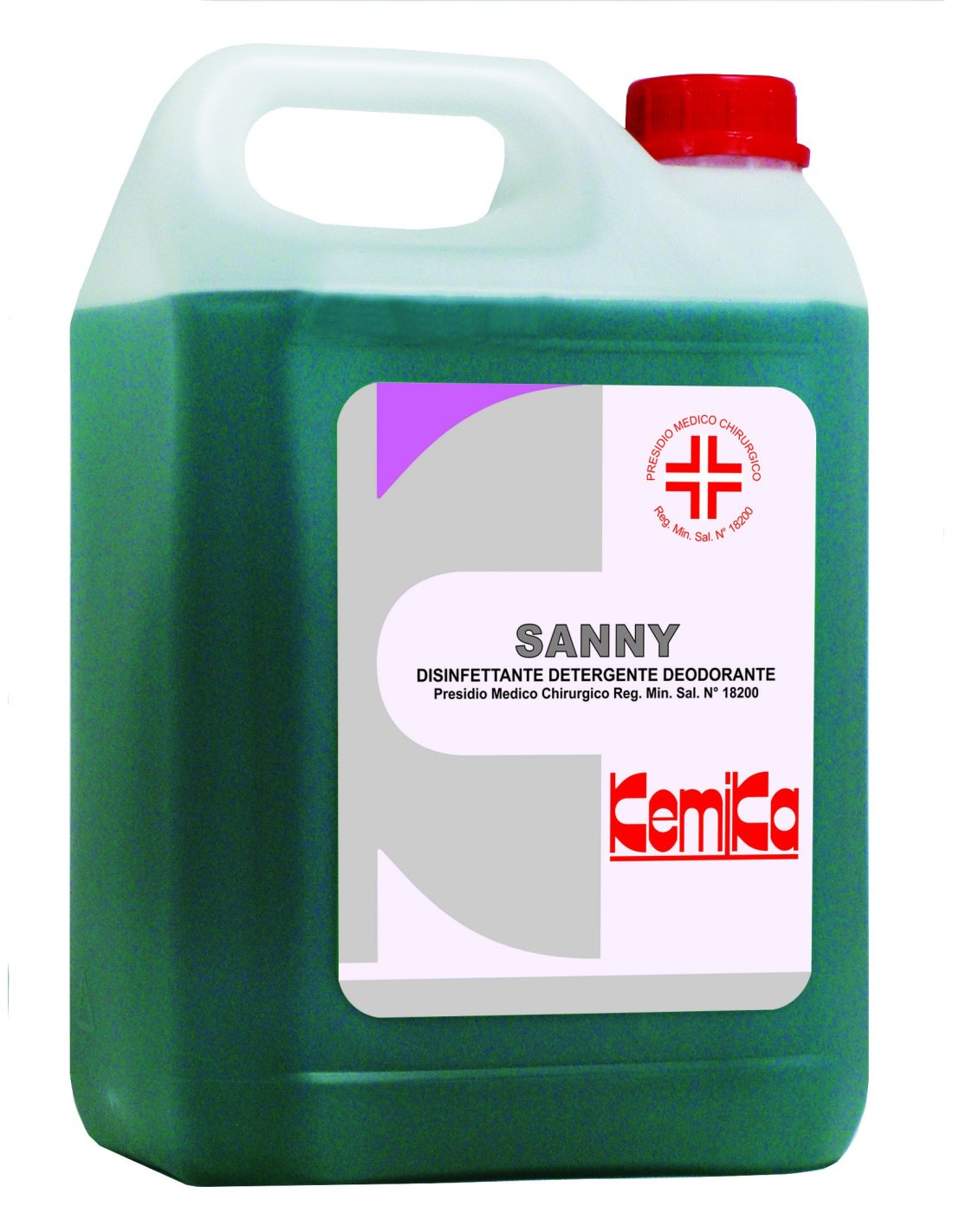 SANNY è un disinfettante detergente deodorante al 3% di quaternario attivo, per la pulizia e disinfezione di tutti i tipi di pavimenti, anche protetti con cere metallizzate, attrezzature (telefoni, tastiere computer, tavoli, spalliere del letto, ecc) e servizi igienici in ospedali, cliniche, convivenze, scuole, alberghi, industrie alimentari, ecc.