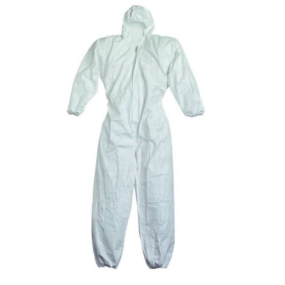 Tuta protettiva in speciale materiale a rilascio particellare nullo, completa di cappuccio con elastico, chiusura lampo nella parte anteriore con patta copri-zip e striscia adesiva per garantire ermeticità contro i liquidi, polsi e caviglie elasticizzati, elastico posteriore in vita per una elevata aderenza al corpo.