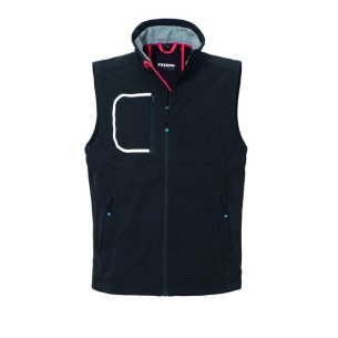 Gilet softshell con chiusura centrale con cerniera antipioggia, coulisse al fondo, profili rifrangenti anteriori e al fondo schiena.