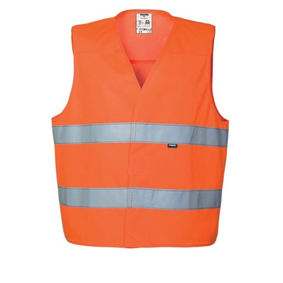 Gilet alta visibilità con chiusura centrale con velcro, collo a V e doppia banda rifrangente al girovita.
