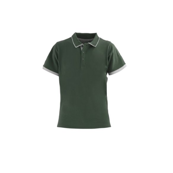 Polo mezza manica da donna con fascia parasudore e bottoniera di colore a contrasto, collo con profilo di colore a contrasto chiuso con tre bottoni, giromanica a costina e spacchetti laterali al fondo di colore a contrasto.