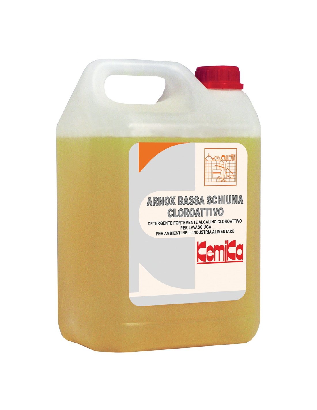 ARNOX BASSA SCHIUMA CLOROATTIVO è un detergente alcalino cloroattivo per il lavaggio e la sanificazione di superfici sporche di grassi di origine alimentare o di altri grassi saponificabili.