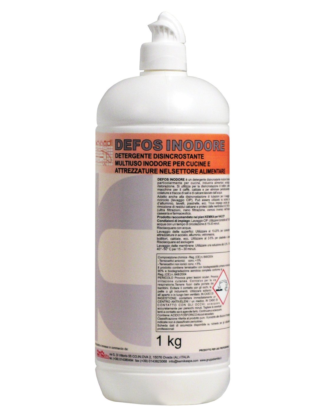 DEFOS é un detergente a base di acido fosforico ed altri agenti sequestranti per la pulizia delle incrostazioni ferruginose o calcaree lasciate dall'acqua o da sostanze alimentari.